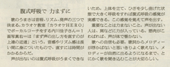 腹式呼吸で力まずに歌のうまさは音程、リズム、発声の三つで決まる。カラオケ教室「カラオケHERO」でボーカルコーチをする内川佳子さんは「まず声の出し方を直すのが上達の近道」という。音感やリズム感は長い間についたもので、直すには時間がかかるからだ。声が出ないのは腹式呼吸がうまく出来ないため。上体を立て、ひざを少し曲げた状態で大きく呼吸をすれば腹式呼吸の感覚が実感できる。この感覚を覚えて声を出す。重要なことは力まないこと。声が出ない人は、肩などに力が入っている。筋肉がこわばれば、声が体で響かない。歌への自信も必要。歌詞からメロディーが浮かばないと思い切りよく歌えない。メロディーが自然に出るようになるまで、とにかく歌を聞き込むことが大切らしい。(上記右) |